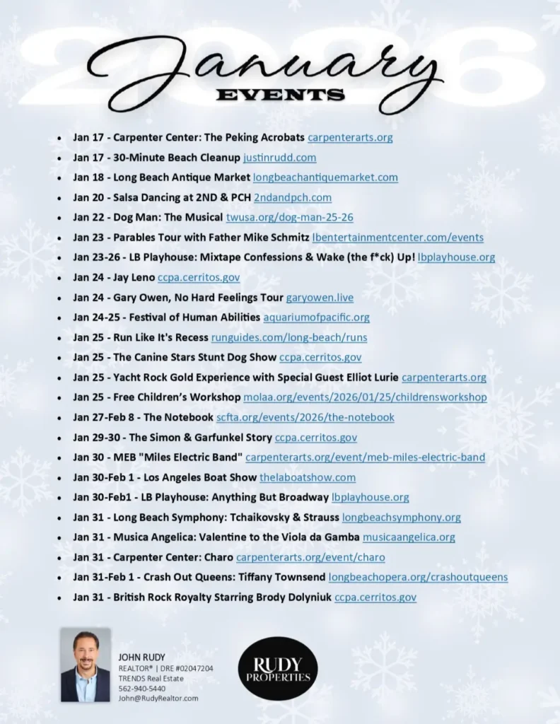 - Jan 18 – Long Beach Antique Market longbeachantiquemarket.com